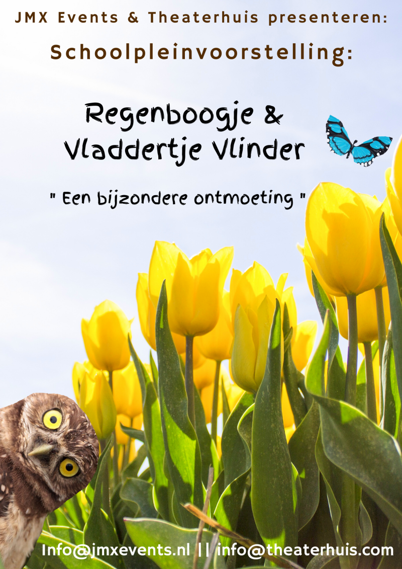 Zo spelen we al heel wat jaren met onze lentevoorstelling " Regenboogje & Vladdertje Vladder " op velen scholen in de Drechtsteden en omgeving. Een vrolijke lenteshow voor de groepen 1 t/m 3 die met mooi weer zelfs lekker buiten wordt gespeeld (versterkt). Dit idee ontstond in Corona-tijd maar is inmiddels al 3 jaar een hit!